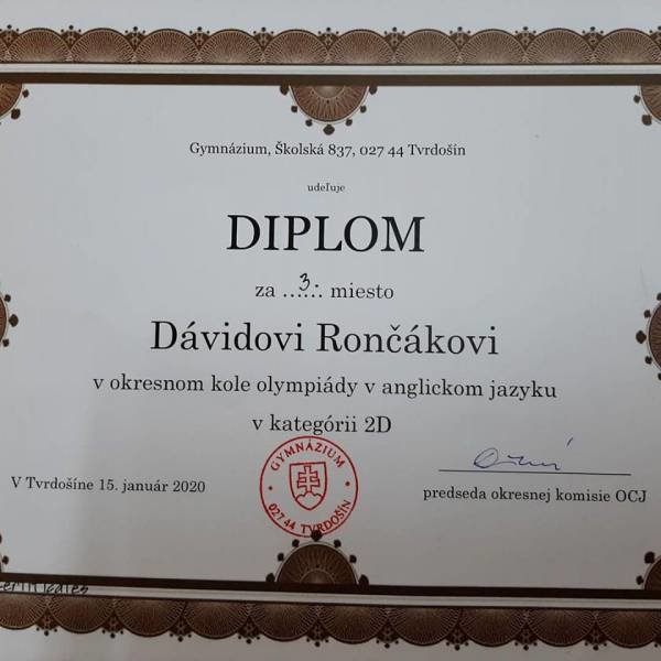 Tešíme sa z úspechu nášho študenta Dávida Rončáka z I.C triedy, ktorý sa na okresnom kole olympiády z anglického jazyka umiestnil na krásnej tretej priečke, ďakujeme za vzornú reprezentáciu!