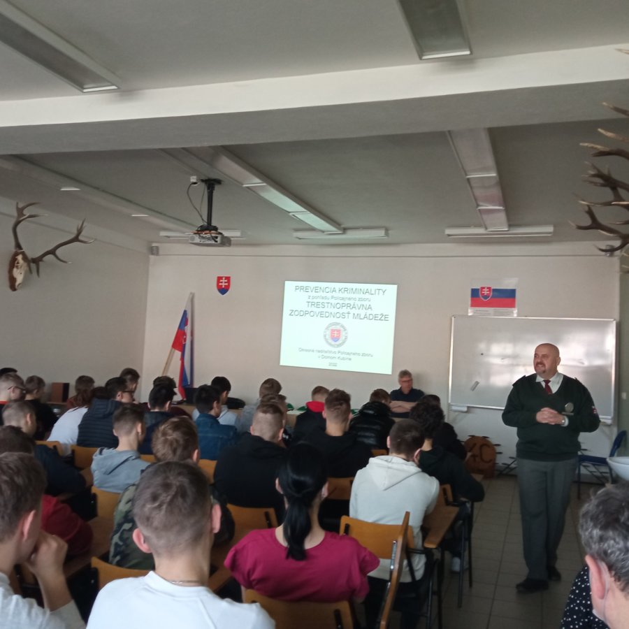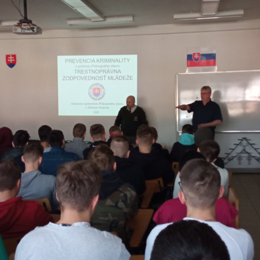 Dňa 20. 4. 2022 sa na pôde našej školy konali prednášky pre študentov 1. a 2. ročníka na tému Trestnoprávna zodpovednosť mládeže, zodpovednosť za priestupky, trestná zodpovednosť za trestné činy. V neposlednom rade bola prednáška zameraná aj na problémy na školách ako záškoláctvo, šikanovanie, nevhodné správanie sa, alkohol a drogy. Prednáška bola realizovaná v spolupráci s Okresným riaditeľstvom Policajného zboru v Dolnom Kubíne. Prednášajúcemu kpt. Mgr. Šándorovi Tiborovi veľmi pekne ďakujeme za pútavú a interaktívnu prednášku.